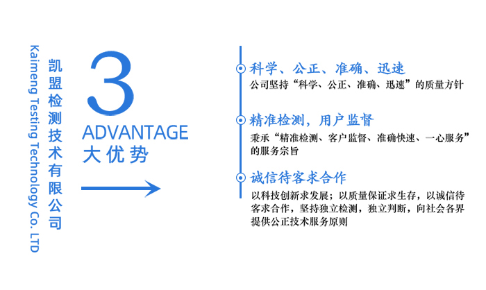 凯盟检测一直秉承“优质高效、服务客户、技术领先、诚实守信、”的理念。恪守科学、公平、公正的原则,严格执行检测标准、规范,竭诚以精湛的技术,优质的服务、严谨的作风为委托方(客户)服务,做具有诚信品牌的第三方检测服务机构。以为客户创造价值为目标,真诚与多地的广大客户双赢合作。